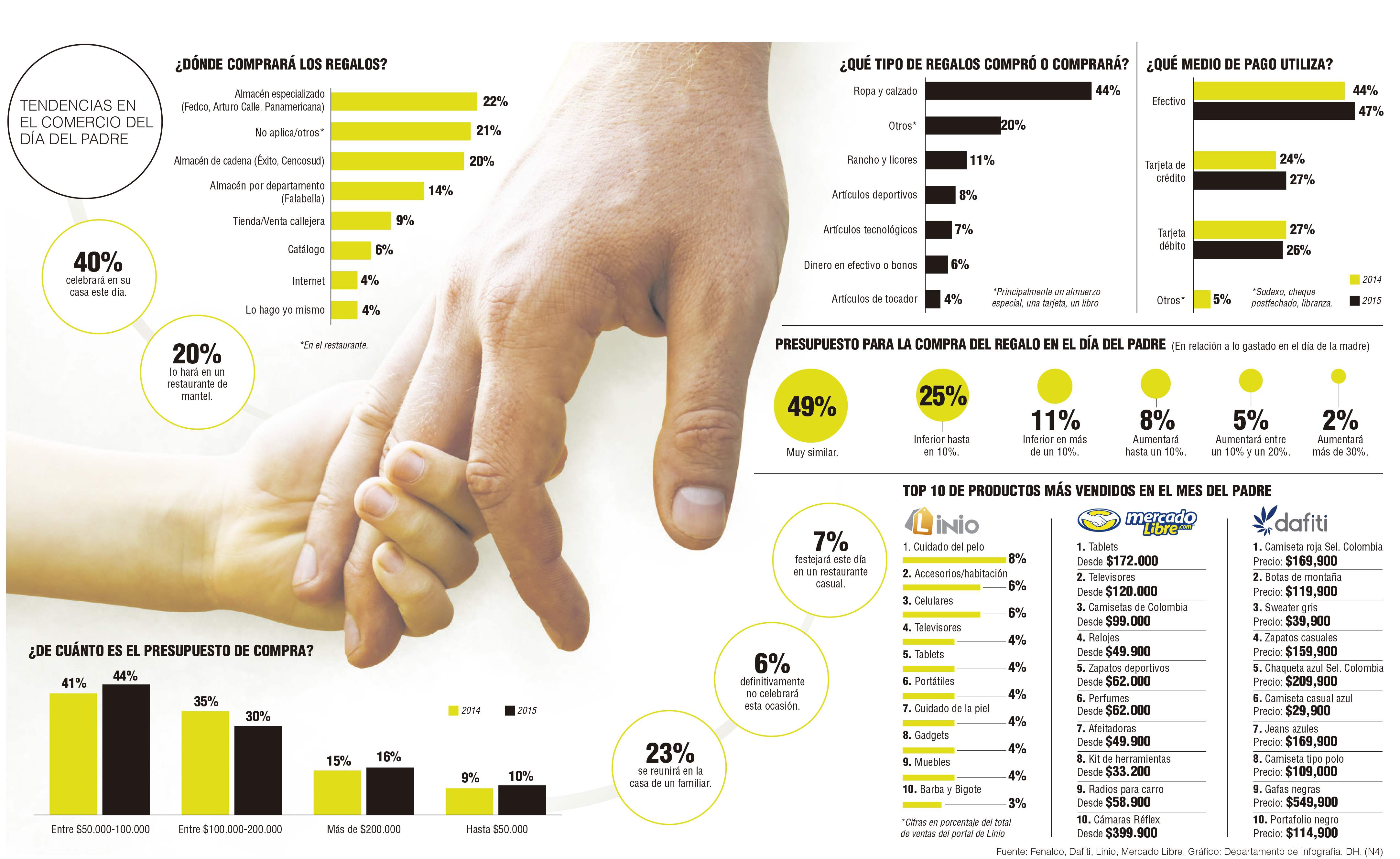 Por lo menos eso es lo que esperan portales de ventas online como Dafiti, Linio y Mercado Libre, así como Fenalco a nivel de comercio tradicional en el país. Precisamente, este gremio publicó una encuesta donde se revela que un 35 por ciento de colombianos está dispuesto a destinar entre 100.000 y 200.000 pesos para comprar este año el obsequio a su papá, mientras que en 2013 el rango fue de 30 por ciento.