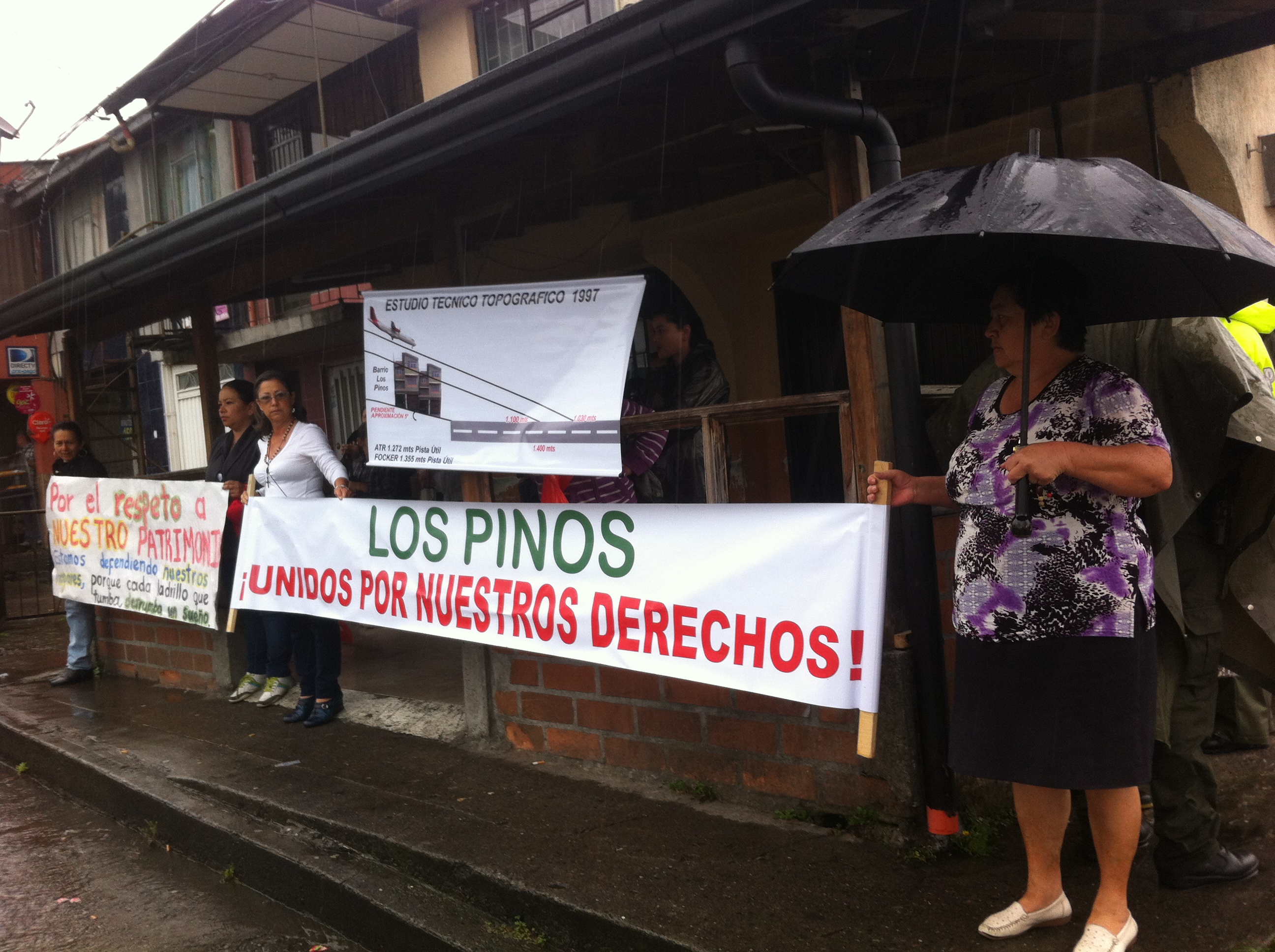 Algunos residentes hicieron frente a la lluvia y salieron ayer con pancartas y carteles para exigir a las autoridades civiles que les permitan conservar sus terceros pisos, luego de conocieran la orden del el Consejo de Estado de derribar parte de las casas y obstáculos que obstaculizan el arribo de aviones por la pista de la cabecera 27 del aeropuerto La Nubia.