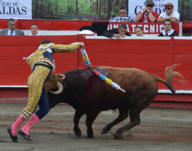 Sebastián Vargas, un torero que sabe banderillear y le gusta, no resistió la convocatoria del público para ponerle al violín un par al toro Muñeco.