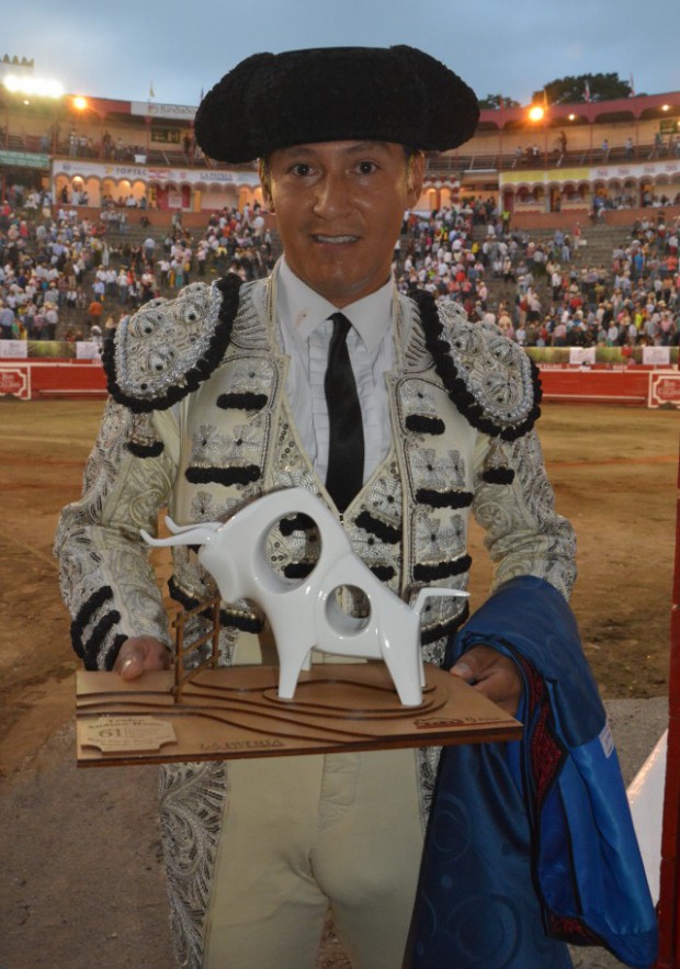 Jhon Jairo Suaza exhibe el trofeo de LA PATRIA y Andino Home al mejor par de banderillas puesto al toro Canciller.