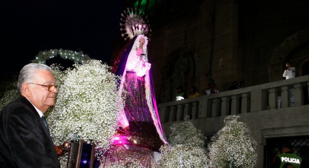 El presidente de la Monumental Luis Bernardo Gómez Upeguillevando la virgen. Al fondo, Santiago Aguirre López, exparticipante de la Voz Kids, entonando el Ave María.