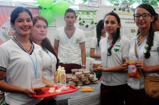 Estudiantes de las instituciones educativas Berlín (Samaná) trajeron arequipe de banano, yogur piña y pulpa de mango, productos que elaboran en sus colegios y venden en tiendas de sus municipios.