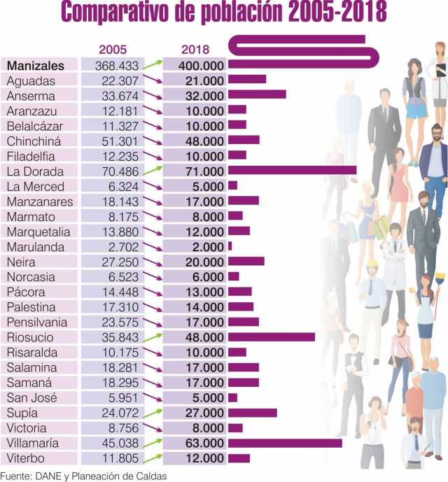 Los únicos municipios que del 2005 al 2018 elevaron su número de habitantes fueron la capital, Manizales, al lado de Villamaría, La Dorada, Riosucio, Supía y Viterbo. Todos los demás perdieron habitantes; los saltos negativos más grandes se vieron en Neira, Palestina y Pensilvania.