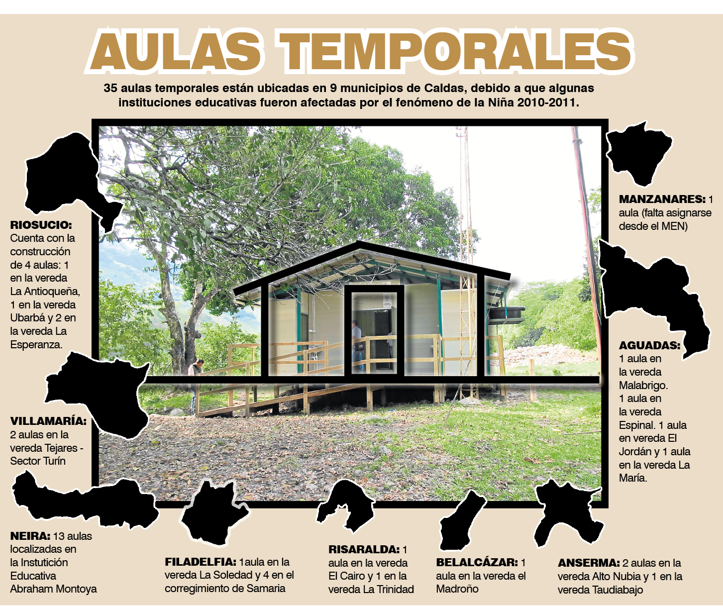 "Hasta el momento ya se encuentran 33 aulas listas y entregadas a los diferentes alcaldes y rectores. Las otras dos, una en Filadelfia, en la vereda La Soledad, no la hemos entregado porque debemos esperar hasta que la Chec termine de hacer unos estudios y la otra, que está en ejecución en Manzanares, esperamos entregarla a finales de este mes", expresó.