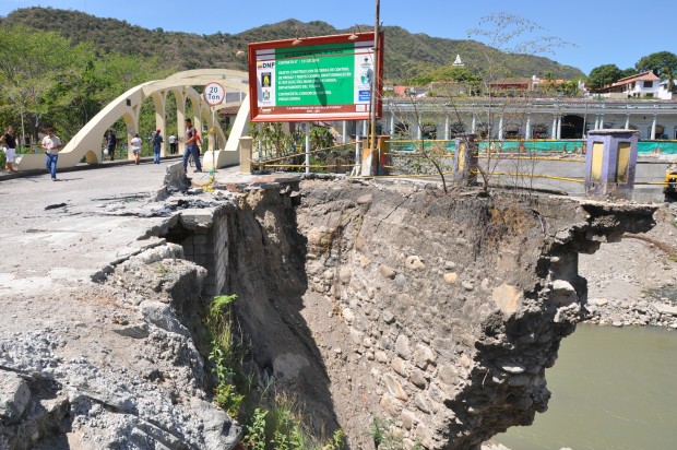 Las fuertes lluvias presentadas en febrero pasado generaron que el 17 de ese mes el caudal del río Gualí se incrementara, ocasionando afectación total del estribo izquierdo y parcial del estribo derecho de la estructura vial.