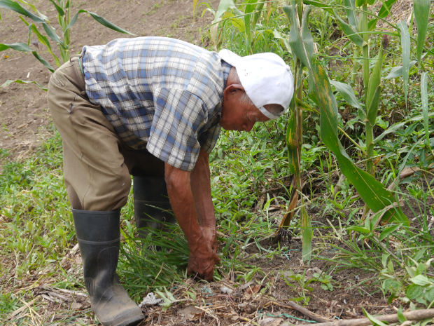 Jesús Antonio Guissao se levanta todos los días a las 5:30 de la madrugada a deshierbar y a cosechar maíz en una pequeña parcela que tiene alquilada frente a su casa, en la vereda La Plata, de Palestina.
