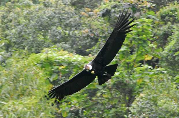 La belleza de ese mirador la completa el vuelo de una pareja de cóndores que anidó en uno de los peladeros una vez la liberaron en 1996, junto con otros 12 de su clase. Últimamente salen después de las 10:00 de la mañana, cuenta Pedro Pablo, generalmente cuando hay sol. Él los conoce de cerca, pues los ve casi a diario, al punto que afirma que un factor para que se animen a volar es la invitación que les hacen los gallinazos. "Saben que él es el rey". En febrero pasado se encontró al macho en su finca, a menos de dos metros de donde él estaba. "Es un animal enorme, un bulto grandísimo", describe.