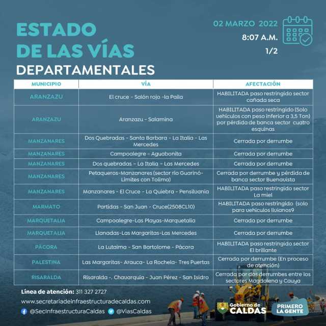 Este es el estado de las vías de Caldas para este miércoles. Las mayores afectaciones se presentan en el oriente del departamento, en donde hay ocho vías cerradas debido a los derrumbes que ha causado el invierno de los últimos días.