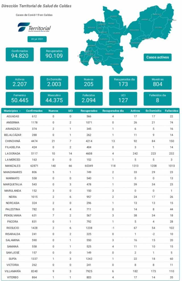 La Dirección Territorial de Salud de Caldas reportó este martes 205 nuevos casos de covid-19 en Caldas, con esta cifra asciende a 94.820 los confirmados.