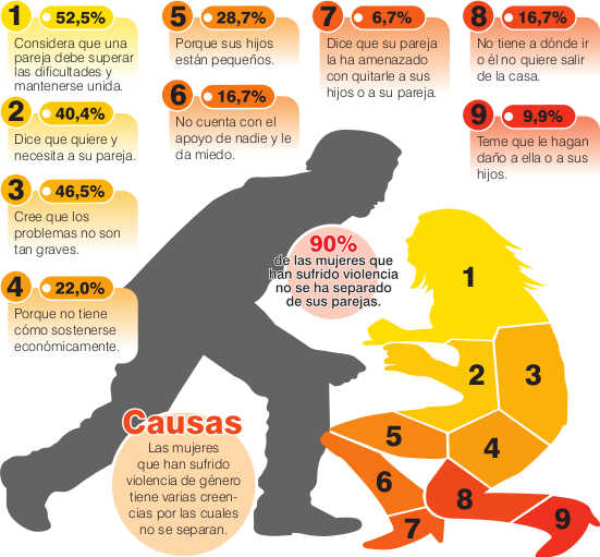 De acuerdo con ONU mujeres, el aspecto emocional y psíquico es lo que más motiva a las personas a soportar una relación violenta. También media el consumo de sustancias psicoactivas, porque aducen que cuando pasa el efecto, su pareja mejora. Otra justificación que no les permite denunciar es por lo hijos o porque carecen de apoyo y algunas manifiestan que deben soportar la cruz que les dejó la vida.