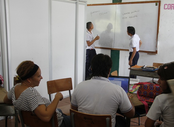 Allí ya es normal que cuando Claudia Yaneth Rodas, profesora de matemáticas, habla de números para los alumnos de 10, la terminen escuchando los de 11 que están viendo español con la docente María del Pilar Arias.