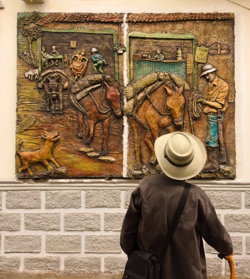 En primer plano está representado con sus mulas Gersaín Botero, conocido arriero de la región y al fondo la Fonda de Roña, personaje típico salamineño.