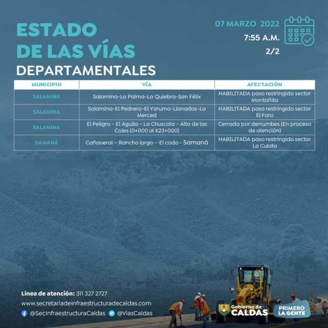 La Secretaría de Infraestructura de Caldas informó este lunes sobre las vías habilitadas y con paso restringido por las lluvias.