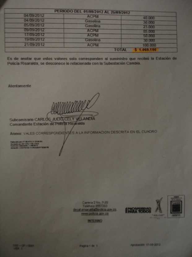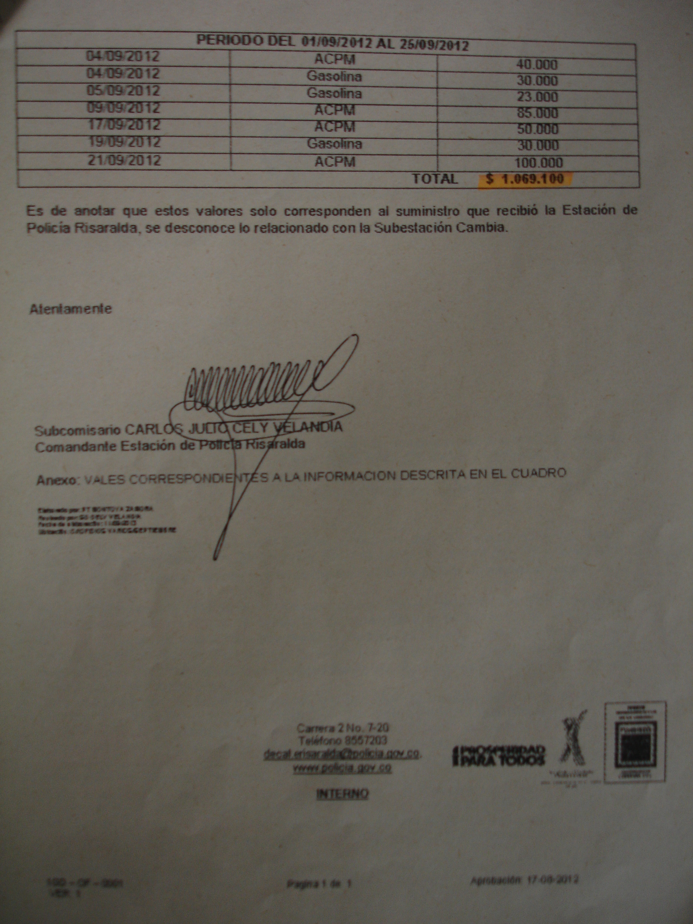 De hecho, 8 de esas 26 órdenes, que suman $1 millón 400 mil presuntamente se destinaron a la Sijín, pero al revisar la información que entregó la Sijín, se lee: "La Unidad Judicial Sijín Anserma posee dos motocicletas Yamaha XTZ 125 y recibe el combustible de la Alcaldía de Anserma, combustible que es suministrado directamente por el comando de ese distrito". Cabe aclarar que la Sijín de Anserma hace parte del Distrito Tercero de Policía Caldas y este cubre a Risaralda. Las 8 órdenes por $1 millón 400 mil carecen de sustento (ver respuesta de la Sijín).