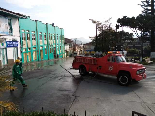 Bomberos de Aguadas realizaron una jornada de lavado de calles. Desinfección de puertas, ventanas y calles incluyó la actividad, como medida preventiva ante el coronavirus.