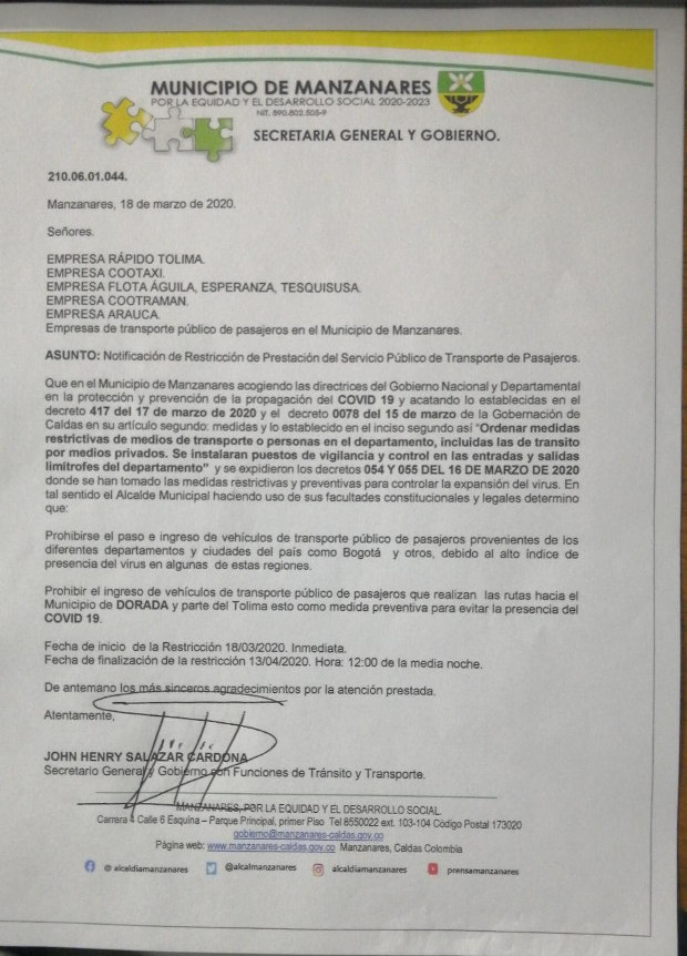 La Secretaría General y de Gobierno de Manzanares anunció ayer que prohíbe el ingreso de pasajeros de La Dorada (Caldas) y Tolima que usen los servicios de transporte de las empresas Rápido Tolima, Cootaxi, Flota Águila, Esperanza y Tesquisusa, Cootraman y Arauca.