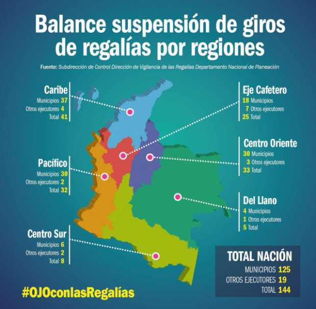 El Departamento Nacional de Planeación suspendió de forma provisional el giro de regalías a 125 municipios del país, correspondientes a 24 departamentos, entre ellos Salamina, Marquetalia y Marulanda por no entregar en forma oportuna el reporte de avance sobre la ejecución de proyectos de infraestructura de interés social.