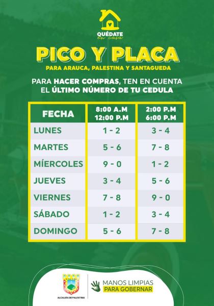 En Palestina el pico y cédula va desde las 7:00 de la mañana hasta las 3:00 de la tarde en jornada continua. Cada día hay designados dos números, el primero puede salir en el horario de 7:00 a.m. a 11:00 a.m. y el segundo de 11:00 a.m. a 3:00 p.m.