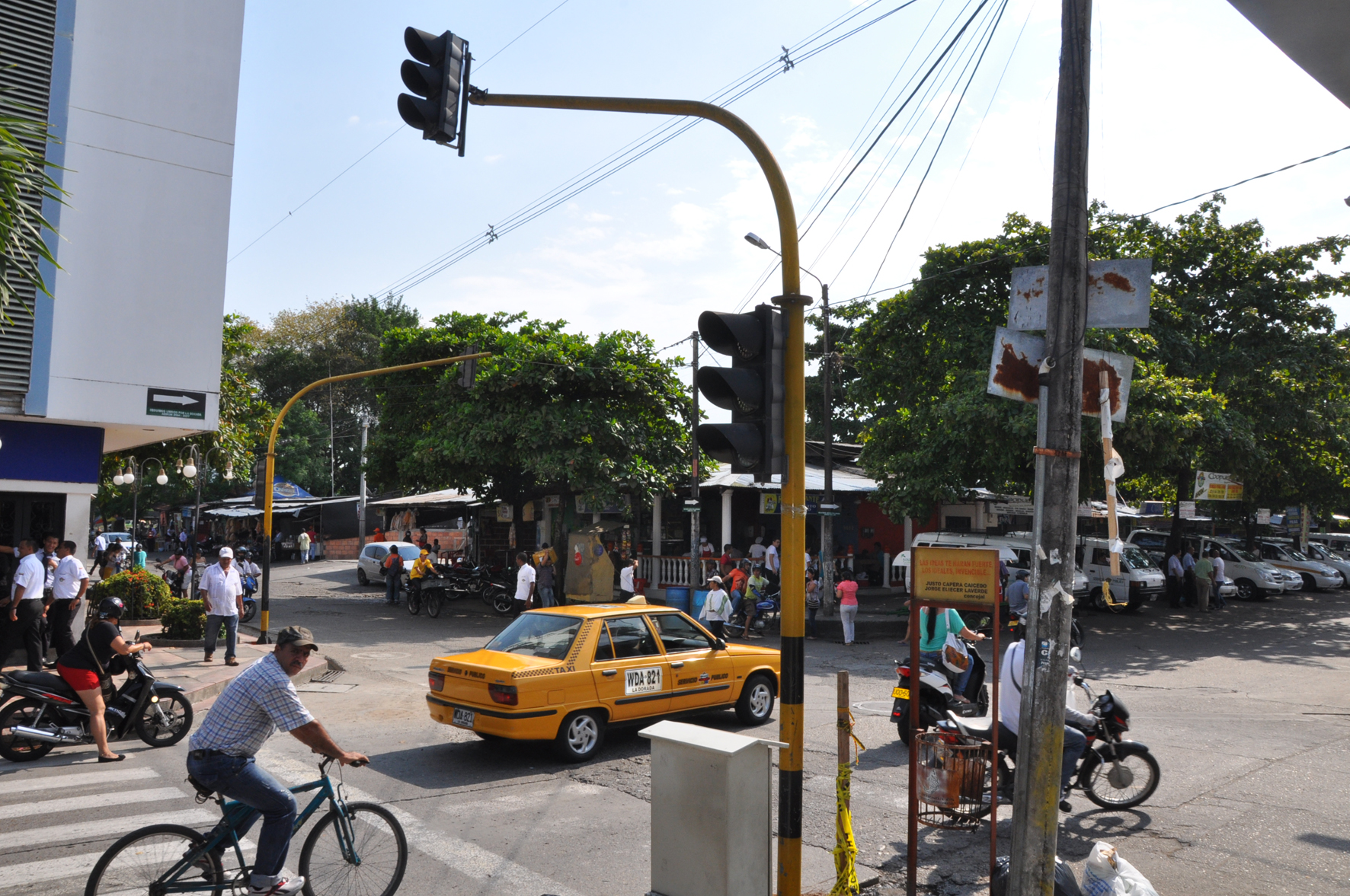 Los únicos semáforos que tiene La Dorada están ubicados en la esquina de la calle 14 con carrera 4 y en la carrera 5. Allí reina la congestión, pues es un sector donde funcionan las empresas interdepartamentales y está el centro del comercio del puerto caldense. Para completar, los semáforos están dañados.