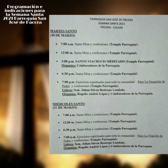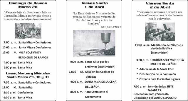 Jueves Santo: misa en la Cena del señor, a las 4:00 p.m., en la Institución Educativa Las Coles; 7:00 p.m. Hora Santa en la capilla.