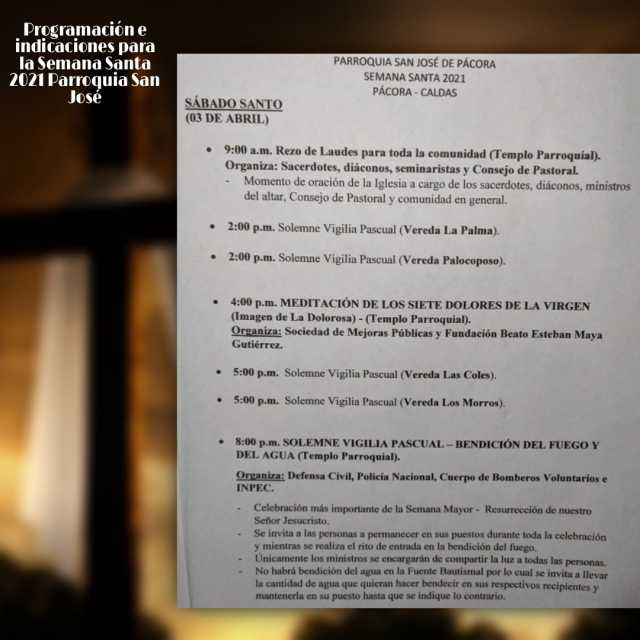 Sábado Santo: Solemne vigilia pascual, a las 5:00 p.m., en la Institución Educativa Las Coles.