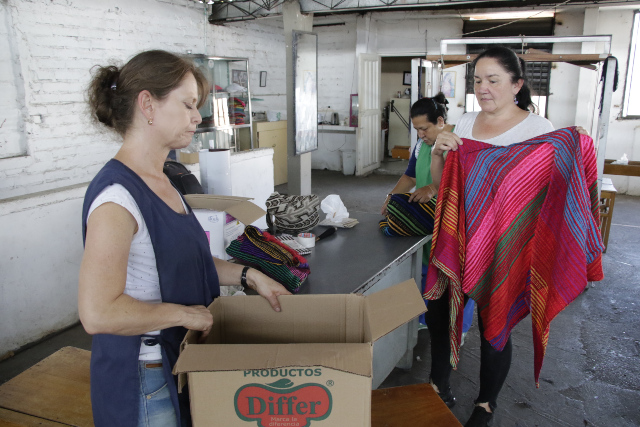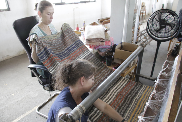 Las Hermana Sandra Patricia y Constanza Viviana Marin Gomez sacan del telar una de las piezas que tiene un diseño único e irrepetible. Esto lo hacen en la bodega del tercer piso de la Galería, donde están los talleres.