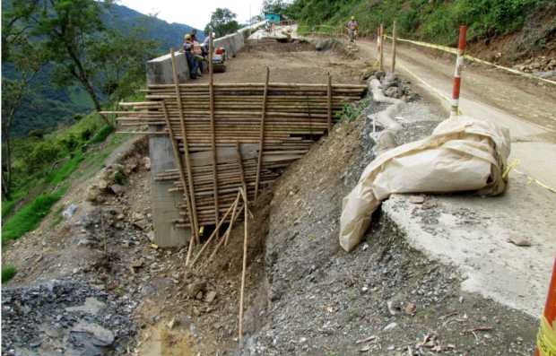 El Carretero es el punto más crítico. Allí se construyó un muro de 33 metros de largo por seis metros de altura, el cual se llenó por completo. Sin embargo, faltaron 65 metros: 50 en la sección de arriba, donde se preveía hacer una pantalla anclada, y 15 metros en la parte inferior, donde el relleno fue cerrado con guadua. En este sitio la banca es estrecha y el tránsito está restringido desde hace varios meses por un solo carril.