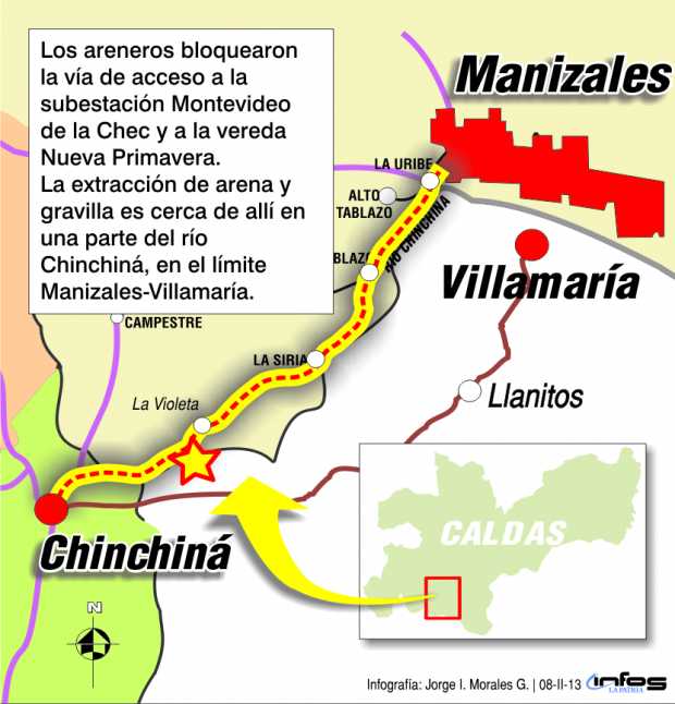 Los areneros artesanales de Chinchiná pararon ayer sus actividades y bloquearon desde las 10: 00 hasta el mediodía el acceso al río Chinchiná, en la entrada por el sector de Pescadero, en la antigua carretera Manizales-Chinchiná. Ellos están molestos porque la empresa Agregados y Constructora Sión tiene lista maquinaria pesada para entrar a extraer material del cauce.