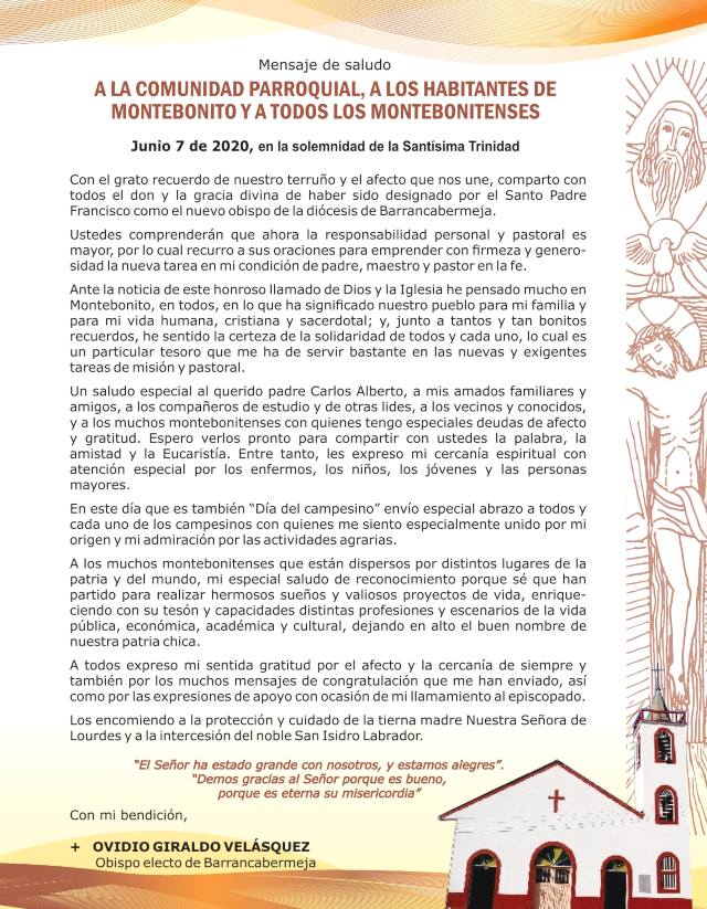 La ordenación episcopal del sacerdote caldense Ovidio Giraldo Velásquez está prevista para la segunda quincena de julio, quizá a puerta cerrada y con pocas personas por la pandemia. A Barrancabermeja llegaría a mediados de agosto para su posesión canónica en la Diócesis. Reemplazará a Camilo Castrillón Pizano.
