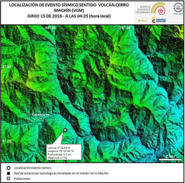 Hoy a las 4:25 de la mañana, se presentó un sismo volcano-tectónico por fracturamiento de roca en el Volcán Cerro Machín. La magnitud del temblor fue de 1.7 ML (Magnitud Local), a una profundidad de 4.2 km.