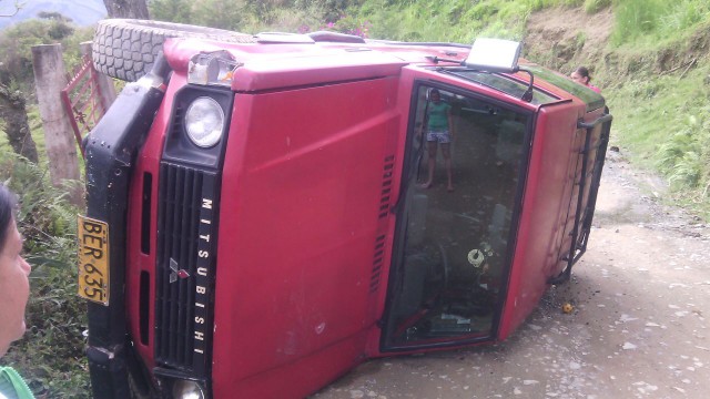 A las 10 a.m. un vehículo se volcó en la vía que conecta a Pácora con el corregimiento Castilla, sector Los Morros. El conductor no sufrió heridas de gravedad. a excepción de algunas laceraciones.
