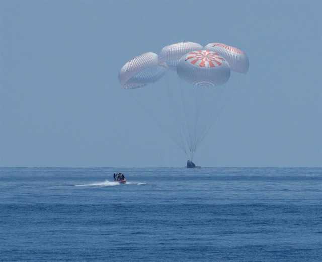 La cápsula Dragon Endeavour de SpaceX, con los astronautas de la NASA Robert Behnken y Douglas Hurley a bordo, cayó este domingo de manera controlada a las aguas del Golfo de México al cabo de un viaje de 19 horas desde la Estación Espacial Internacional (EEI).