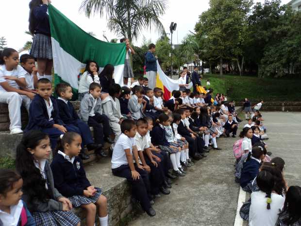 Estudiantes de grado quinto y su directora de grupo, Mercedes Vanegas, de la Normal de Anserma, le rindieron homenaje al pabellón nacional con el objetivo de destacar a los mejores alumnos de este curso.