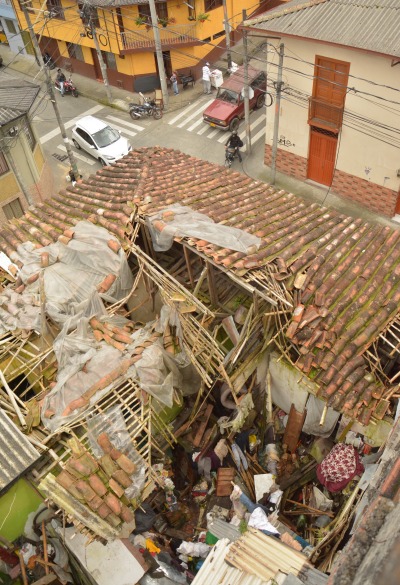 La esquinera, desde la parte alta se le nota el mal estado. Según un vecino que pidió reserva de su nombre, el deterioro de estas casas se registra desde hace unos 15 años y nadie les ha puesto cuidado ni reparado. "Viene Policía, Bomberos, Cruz Roja, pero no han hecho nada". Otros vecinos dicen que en la esquinera vive un hombre y una mujer, que se niegan a abandonar la propiedad.