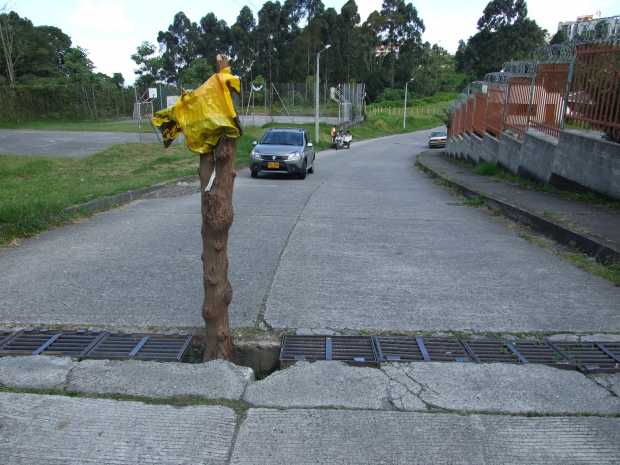 Detrás del colegio INEM se robaron parte de una reja de alcantarillado, que atraviesa la vía de dos carriles. Algunos ciudadanos metieron un tronco de árbol para evitar que quienes circulen por allí se accidenten.