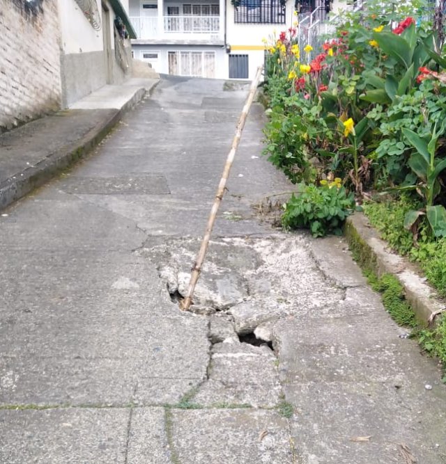 Entre la calle 20 y el tramo de calle que comunica el barrio Los Prados con la Avenida El Libertador, el pavimento cedió y apareció un nuevo hueco que tiene preocupados a los conductores, peatones y vecinos del sector. Todo obedece, al parecer, al mal estado de la red de alcantarillado del sector. Este hundimiento se suma a varios daños de este tipo que siguen esperando las obras de Empocaldas. La señalización es una guadua.