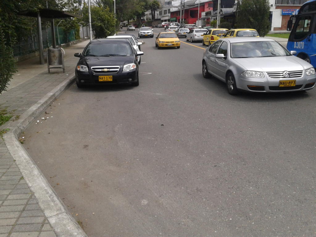 Un ciudadano denuncia el parqueo de carros en un paradero a la entrada del barrio Milán, en un andén de la parte trasera de la empresa Mabe. Las busetas que vienen de Alta Suiza no pueden parar ahí para recoger a los pasajeros, sino que les toca más adelante, en medio de la vía.
