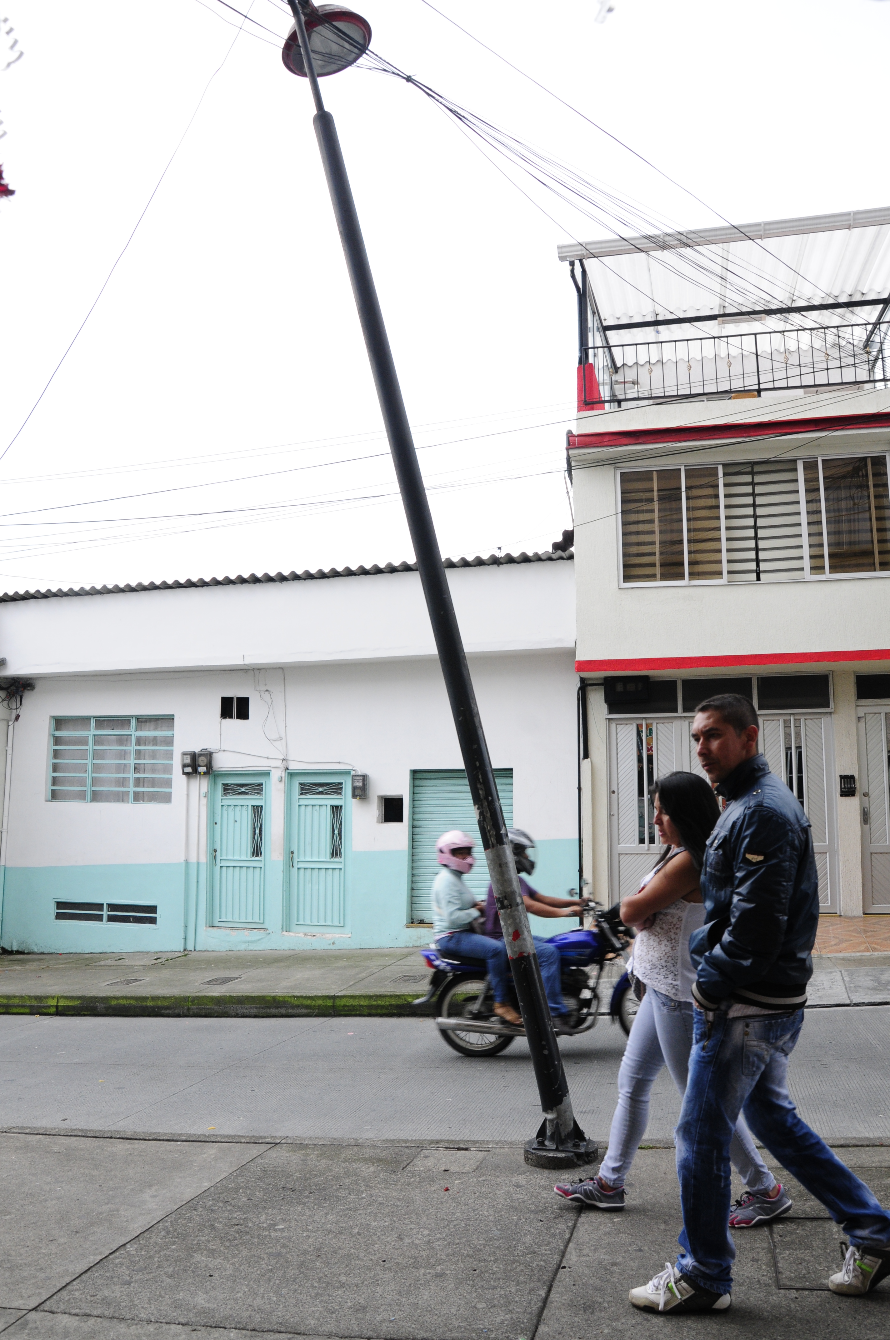 Un año lleva ladeado un poste en la carrera 24 con calle 32, cuentan habitantes del sector. Declaran que una volqueta, cuando entraba material a una casa, lo golpeó e inclinó y dañó la lampara. Añaden que con las fuertes lluvias el poste se podría debilitar y caer.