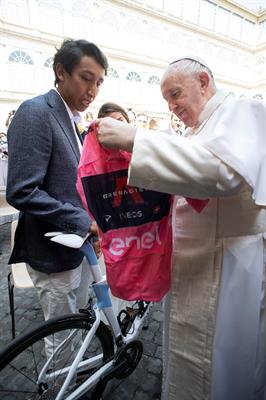 El reciente vencedor del Giro de Italia, Egan Bernal, regaló hoy al papa el maillot rosa y una bicicleta con los colores de la bandera argentina en nombre de "todos los colombianos" y aseguró que esta experiencia ha sido para él "más importante que ganar el Giro y el Tour".
