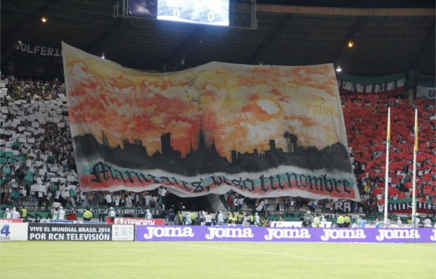 Ni qué decir de Holocausto. La tribuna norte se tiñó de los colores del Once del alma con papeles verdes, blancos y rojos organizados en el mismo orden de la bandera; y le rindió homenaje a la capital caldense con un trapo que cubrió casi toda la tribuna y en el que sí dibujaba la ciudad.