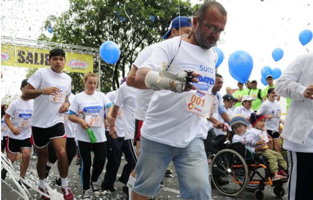 Llamaron para la salida a los atletas con discapacidad y ellos fueron los primeros en pasar. Jhon Alexánder y Liseth Tatiana se pusieron en primera fila con sus dos pequeños, Juan Felipe y Ángel Matías.