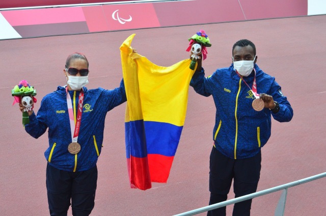 La primera medalla la obtuvieron Angie Pabón y Luis Dahir Arizala, quienes alcanzaron el bronce en los 400 MTS T11 en atletismo y con un tiempo de 57.46.