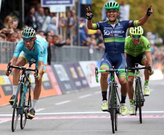 El ciclisita Esteban Chaves (Orica) se convirtió ayer en el primer colombiano en ganar el Giro de Lombardía. El bogotano se impuso sobre la línea de meta al italiano Diego Rosa y al antioqueño Rigoberto Urán, los tres del podio que entraron con el mismo tiempo.