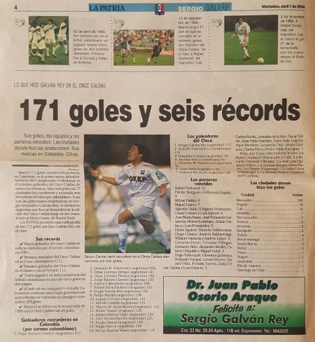 Récords: Máximo goleador del Once Caldas con 185 goles y el máximo de fútbol colombiano con 224 goles.