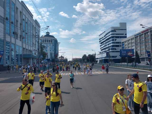 En Moscú, en San Petesburgo, por Kazán y en otras ciudades se veían algunos colombianos en los días previos, pero este martes se reunieron todos en Saransk para el debut de la Selección Colombia frente a Japón y las calles, el Fan Fest y los alrededores del estadio, se pintaron de amarillo para confirmar que fue el cuarto país que más entradas compró para la Copa Mundial de la FIFA Rusia-2018.