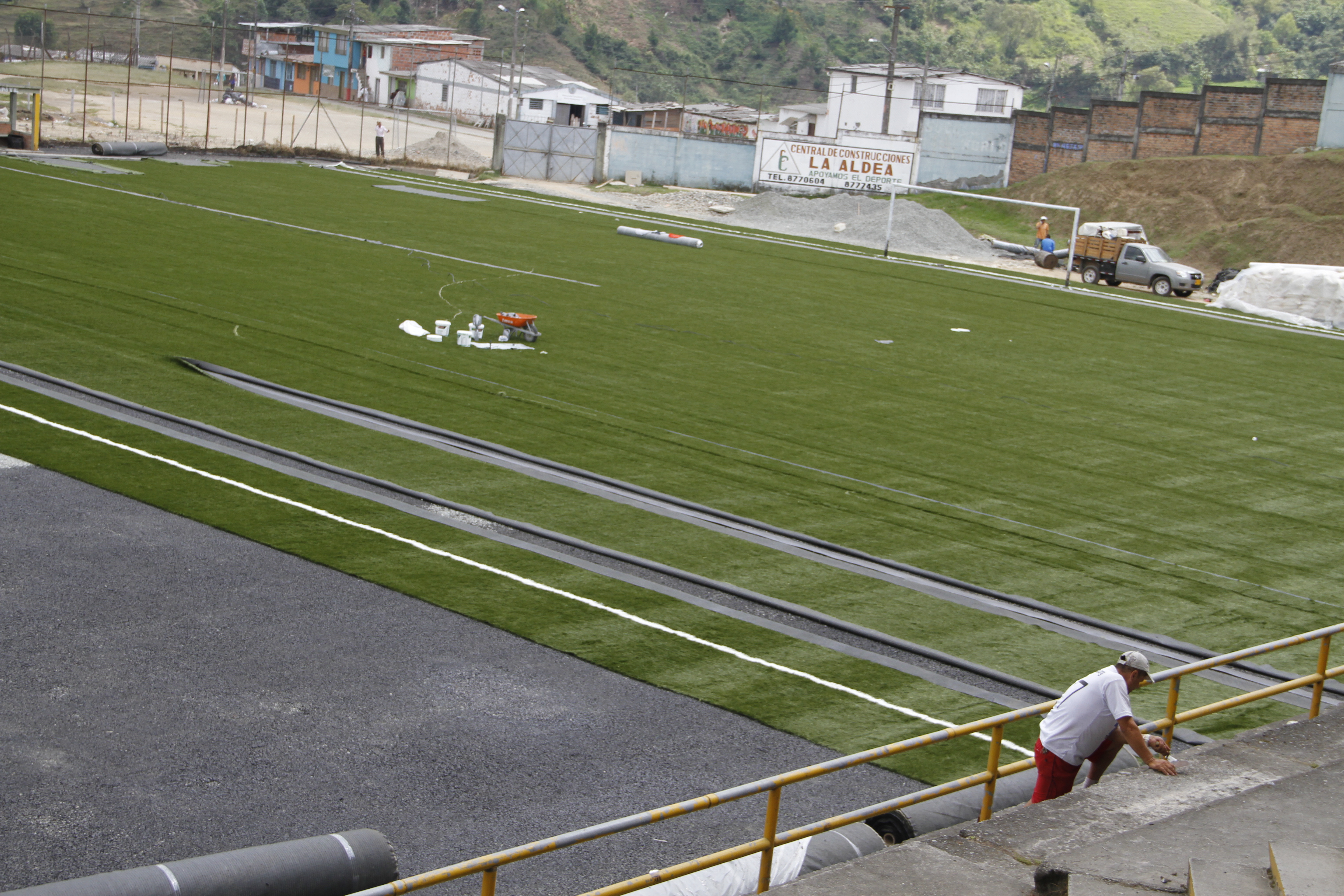 La grama se instala desde el pasado sábado y la intención es dejarla lista este fin de semana. Sin embargo, en las dos semanas siguientes se echará la arena y el caucho molido. La empresa encargada de la última etapa es Forbex, la misma que adecuó la cancha sintética Luis Fernando Montoya, de Manizales. El contrato para los 6 mil 520 metros de grama fue por $850 millones, según datos suministrados por el Consorcio A y J, de la capital de Caldas.