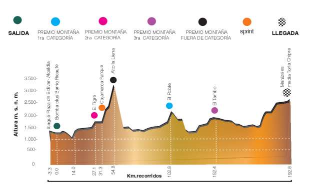 La jornada de hoy es la primera vez que se disputará en el ciclismo colombiano. Los ciclistas saldrán de Ibagué y llegarán a Manizales, después de pedalear 193 kilómetros y superar siete premios de montaña, dos de ellos fuera de categoría, uno en el Alto de La Línea y el otro en la meta, en Chipre.