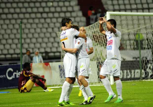El Once Caldas por fin celebra una victoria. Le ganó 4-0 al Tolima en el partido que acaba de terminar. La hinchada celebra, igual que el técnico Santiago Escobar.