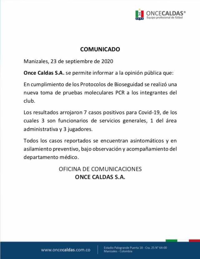 El Once Caldas informó este miércoles que después de una nueva toma de pruebas moleculares PCR a los integrantes del club siete resultaron positivos de covid-19.