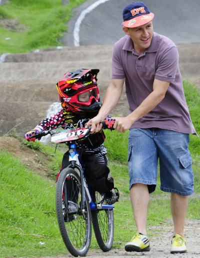 Matías Pineda García solo tiene tres años y no se baja de la bicicleta. También practica el down hill porque desciende sin problema por la pista del Bosque Popular El Prado. Él fue el competidor más pequeño de la Copa. William, su padre, no se le despega y lo apoya con su esposa, Alejandra.